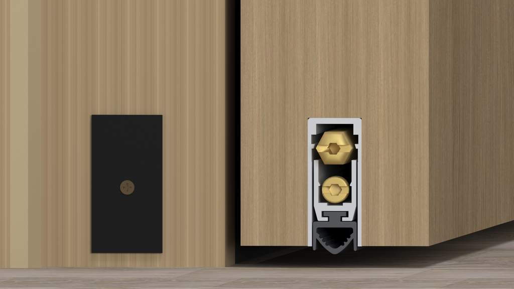 Запатентованный механизм с параллельным опусканием подвижного профиля с уплотнителем, отличается системой с двойной регулировкой (винт E: опускание - винт R: наклон) для сильного равномерного прижима по всей длине.