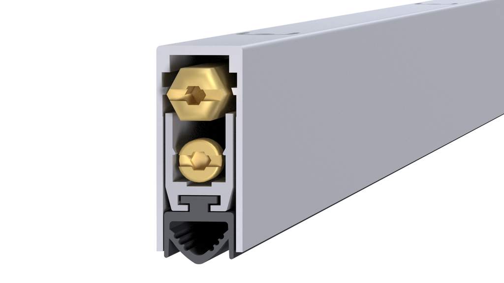 Запатентованный механизм с параллельным опусканием подвижного профиля с уплотнителем, отличается системой с двойной регулировкой (винт E: опускание - винт R: наклон) для сильного равномерного прижима по всей длине.