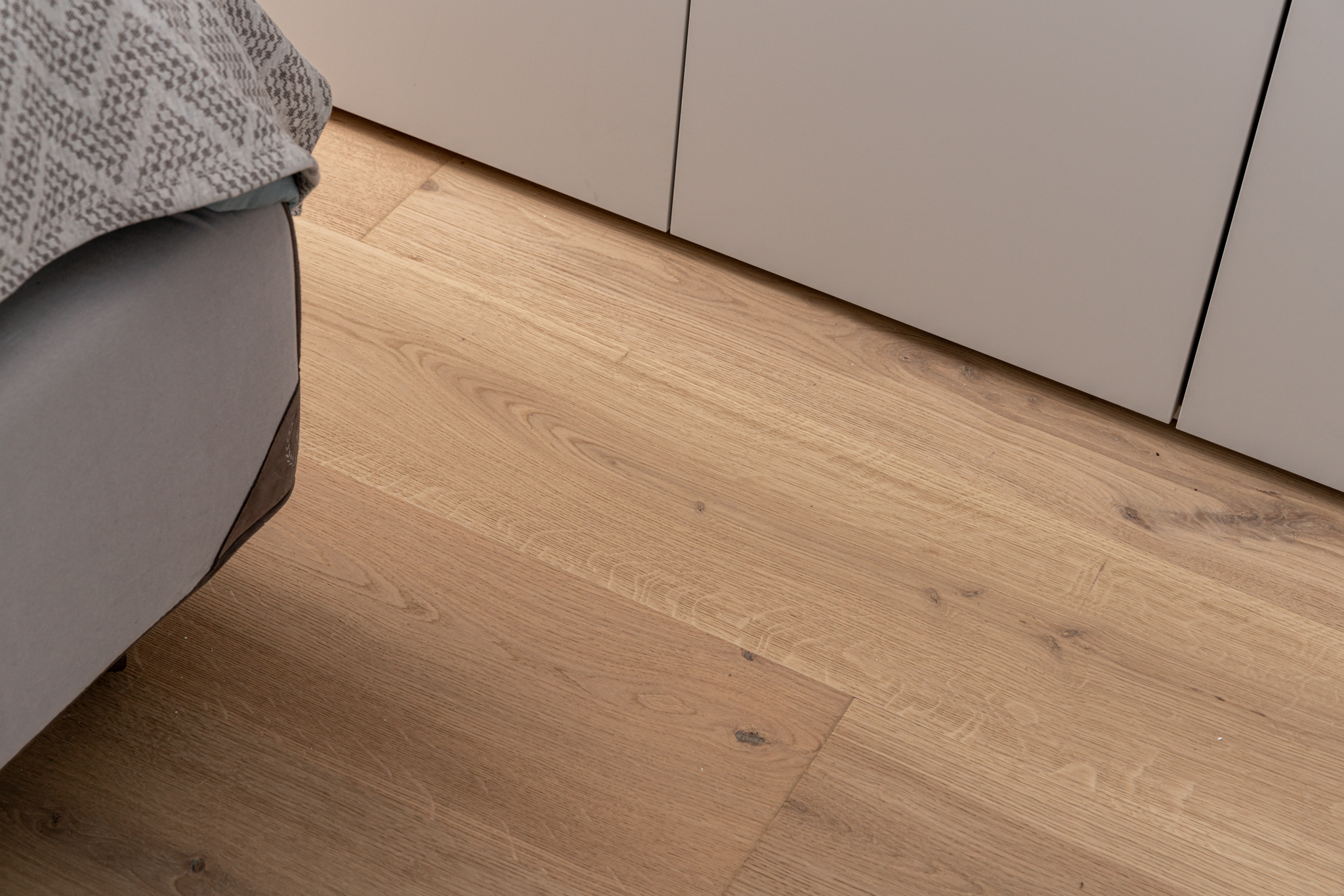На этот раз обновление коснулось квартиры для девушки, где, смонтировав черновое основание из берёзовой фанеры, на клей «Kleiberit 583.6» уложили паркетную доску. Пол сделали одинаковым во всех помещениях, кроме санузла и ванной комнаты, использовав покрытие с хорошей износоустойчивостью.