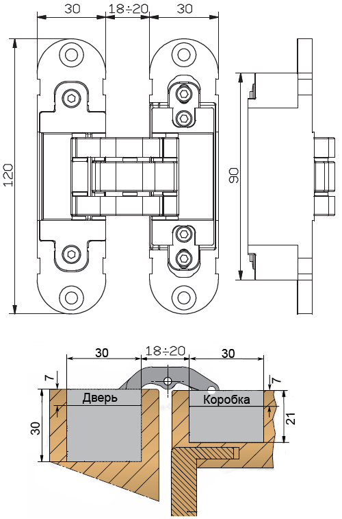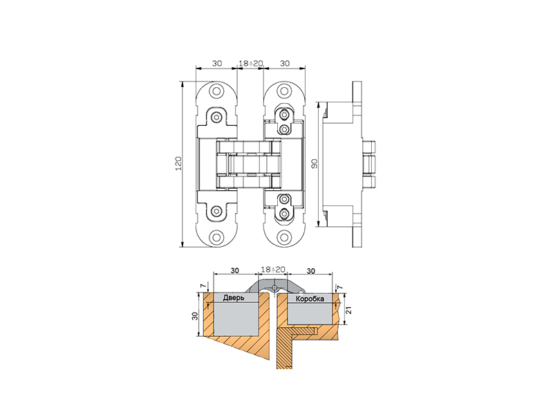 Петля скрытая, универсальная, 3D, 120x30 мм, 80 кг, цамак/алюминий, никель матовый