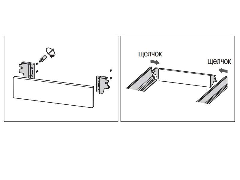 Держатели закрепляются на задней стенке при помощи саморезов из комплекта, а затем защелкиваются в пазы на боковинах ящика.