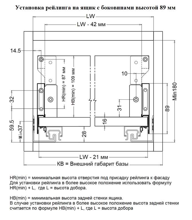 Высота задней стенки ящика = HB (min) + 50 мм + L, где