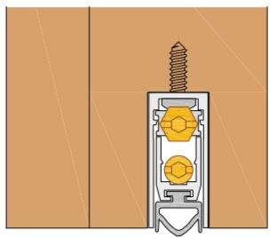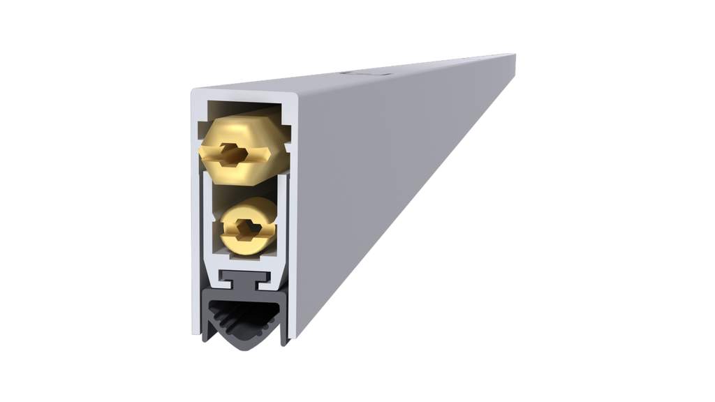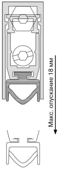 Запатентованный механизм с параллельным опусканием подвижного профиля с уплотнителем, отличается системой с двойной регулировкой (винт E: опускание - винт R: наклон) для сильного равномерного прижима по всей длине.